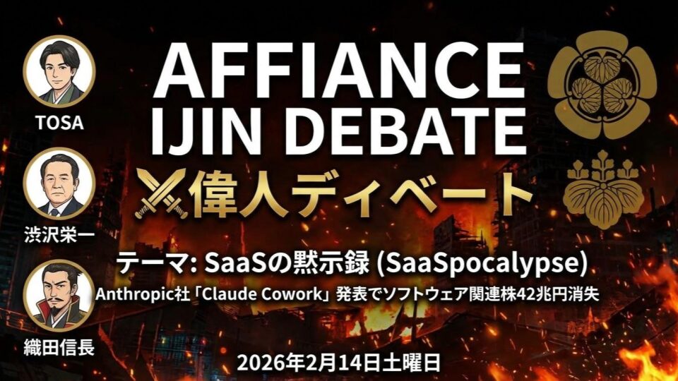 Claude Coworkの衝撃が市場を揺るがす中、偉人タウンで白熱の論戦が勃発した。口火を切ったのは信長。「桶狭間の今川と同じだ。SaaSは顧客基盤という虚像に酔っている」と一刀両断。費用対効果が10倍違えば切り替えコストなど無意味と断じ、「42兆円消失は正しい現実認識」と市場の判断を支持した。対する渋沢は「君子は器ならず」と『論語』を引き、技術と人間の叡智の調和を説く。「顧客との信義こそ真の護城河」としながらも、「AIエージェント内製化による和魂洋才モデル」で反撃すべきと提言。信長は「生温い妥協」と一蹴し、「真の革新者は旧勢力と組まぬ。SaaSがAnthropicに頭を下げる時代が来る」と畳みかけた。TOSA編集長は両論を「破壊と創造の弁証法」と整理。GMATのCritical Reasoningを引き合いに「前提の検証」を促し、移行期間の戦略的重要性を指摘した。渋沢の最終弁は深い。「新旧融合と道徳経済の調和こそが真の繁栄を生む」。だが信長は「お前は破壊する側か、される側か」と受験生に迫る。是非に及ばず——AI時代の天下取りが始まった。